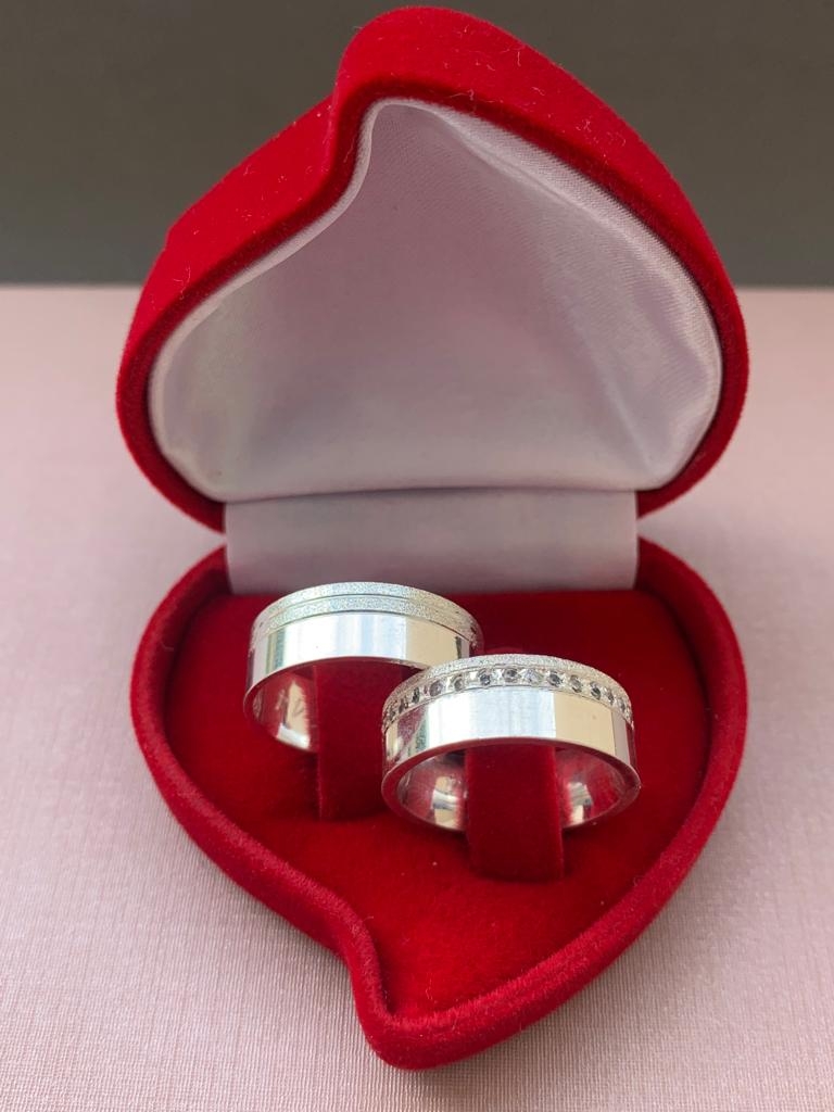 Par de aliança de prata reta anatômica com acabamento diamantado e friso 7mm